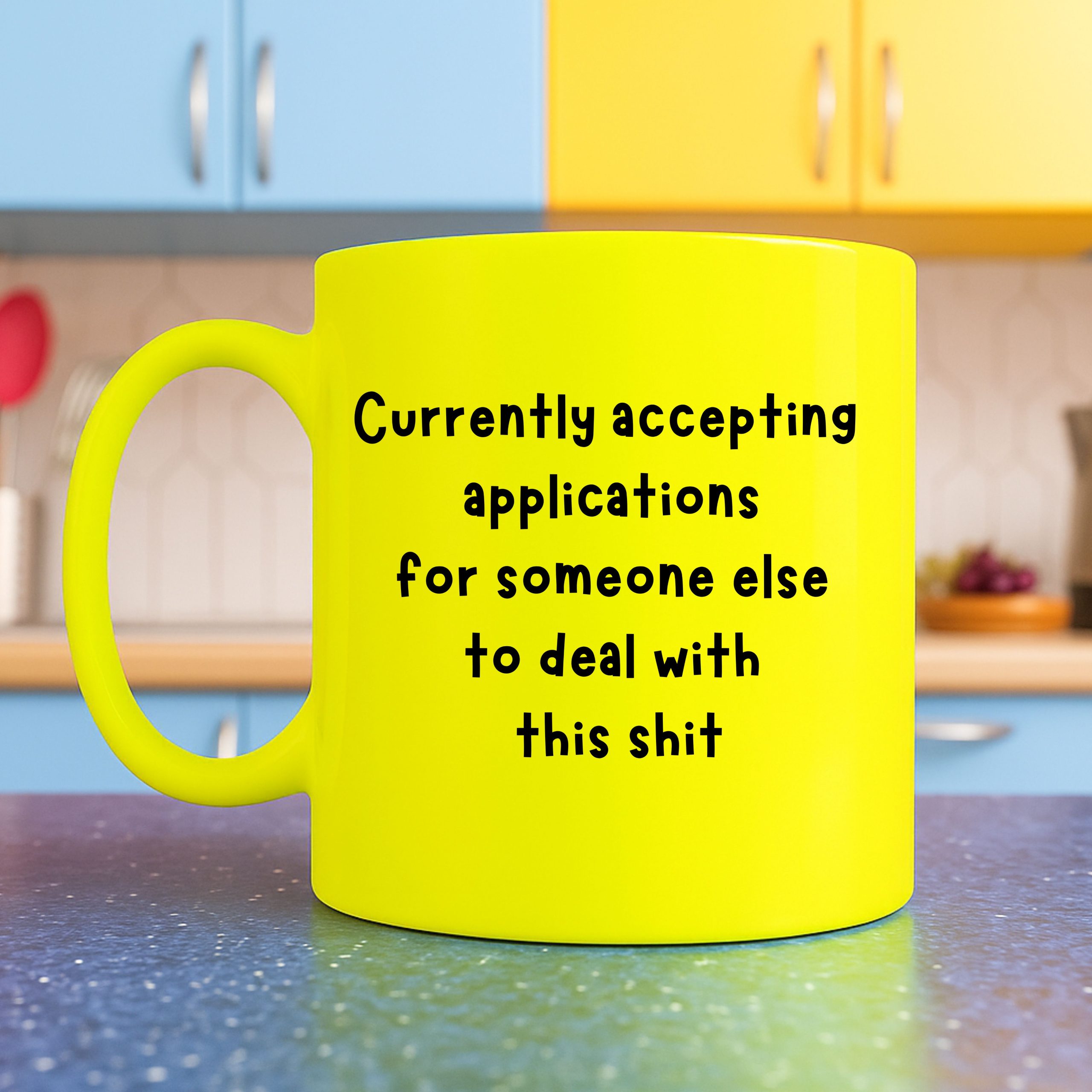 This neon yellow ceramic mug delivers that message loud and clear. Bold black text on an eye-catching background makes it impossible to ignore — perfect for office desks, kitchen counters, or passive-aggressive tea breaks.
