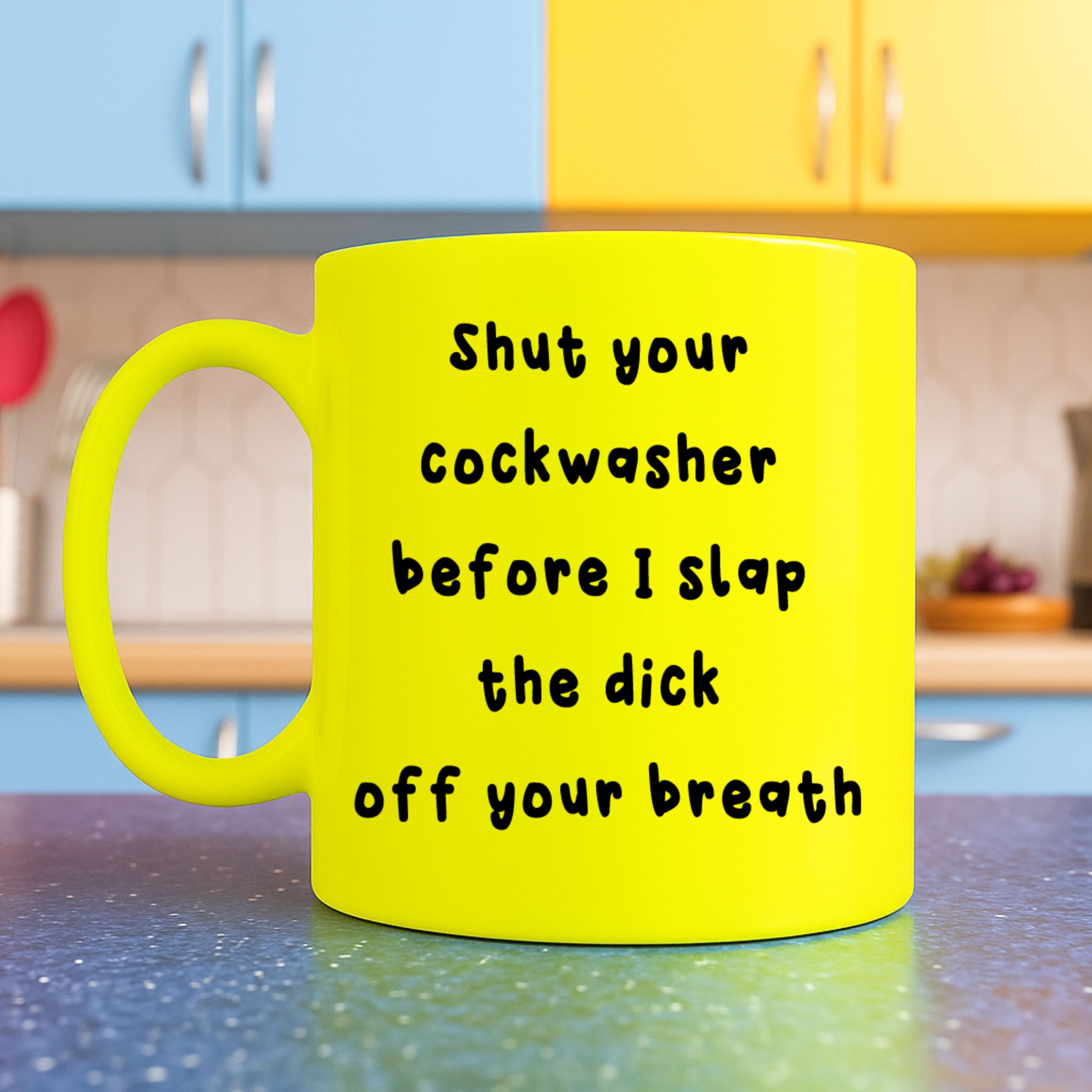 Ideal for birthdays, office banter, housemates, best mates or anyone who should really shut their cockwasher before speaking. This is not a subtle mug — it’s a warning.